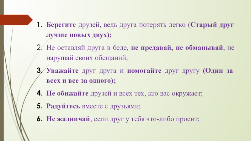 Берегите друзей, ведь друга потерять легко (Старый друг лучше новых двух);Не оставляй друга в беде, не предавай,