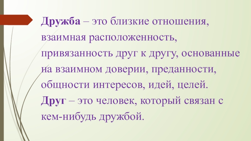 Дружба – это близкие отношения, взаимная расположенность, привязанность друг к другу, основанные на взаимном доверии, преданности, общности