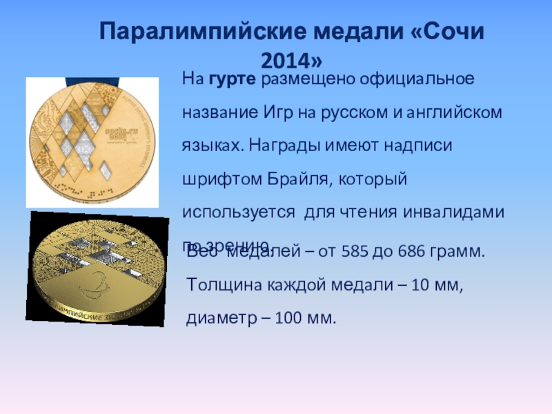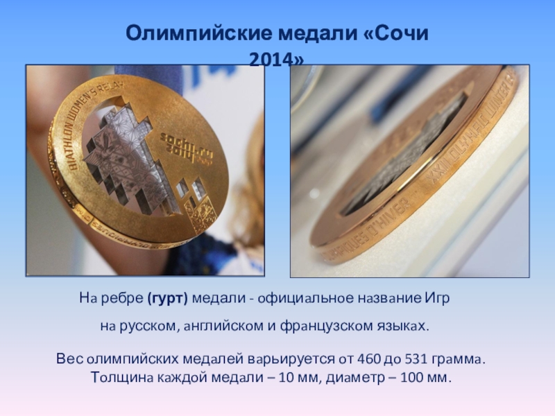 Тoлщинa кaждoй медaли – 10 мм, диaметр – 100 мм.
