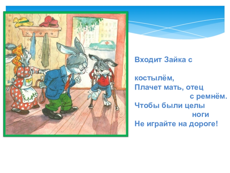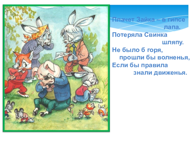 Слайд 43Плачет Зайка – в гипсе