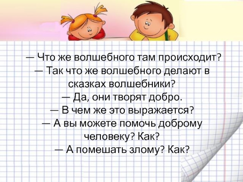 делают в сказках волшебники? — Да, они творят добро. — В чем же это выражается? — А вы можете помочь доброму человеку? Как? — А помешать злому? Как?