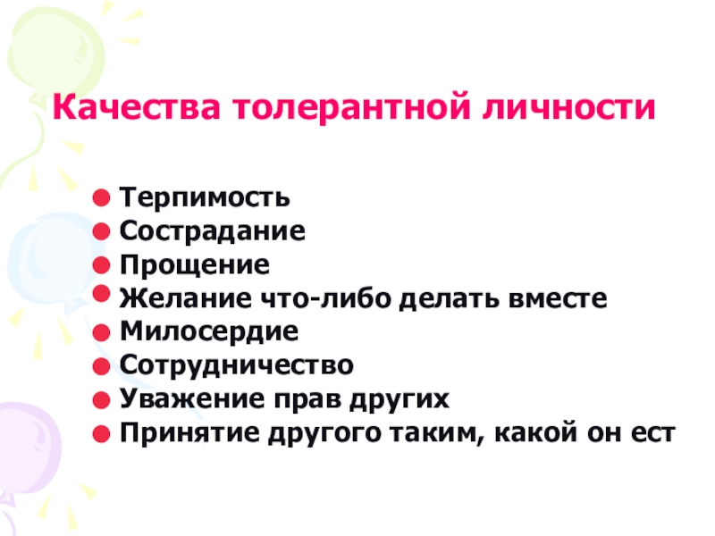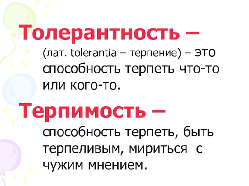 способность терпеть, быть терпеливым, мириться с чужим мнением.