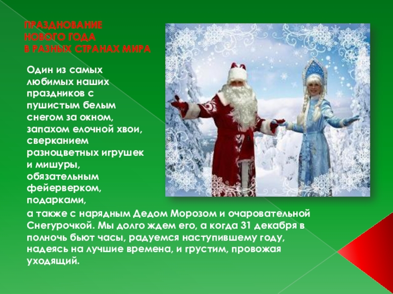 а также с нарядным Дедом Морозом и очаровательной Снегурочкой. Мы долго ждем его, а когда 31 декабря в полночь бьют часы, радуемся наступившему году, надеясь на лучшие времена, и грустим, провожая уходящий.