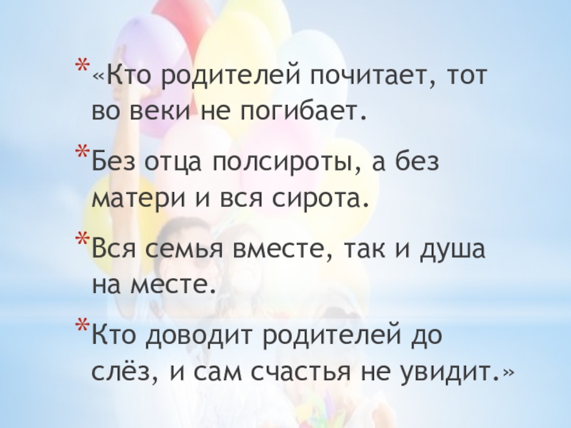Слайд 14«Кто родителей почитает, тот во веки не погибает.