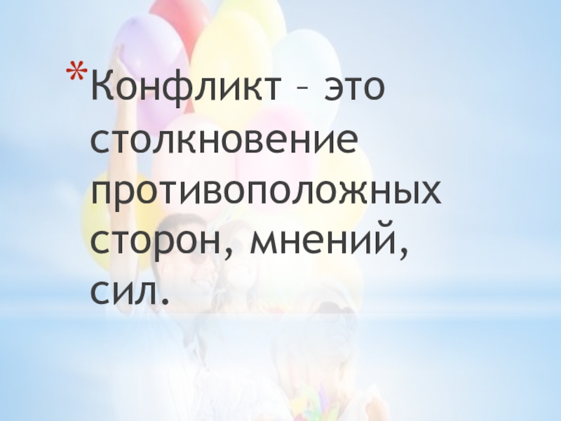 Слайд 11Конфликт – это столкновение противоположных сторон, мнений, сил.