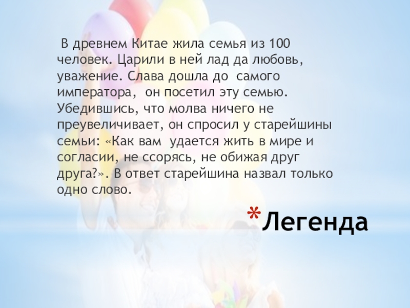 ней лад да любовь, уважение. Слава дошла до самого императора, он посетил эту семью. Убедившись, что молва ничего не преувеличивает, он спросил у старейшины семьи: «Как вам удается жить в мире и согласии, не ссорясь, не обижая друг друга?». В ответ старейшина назвал только одно слово.