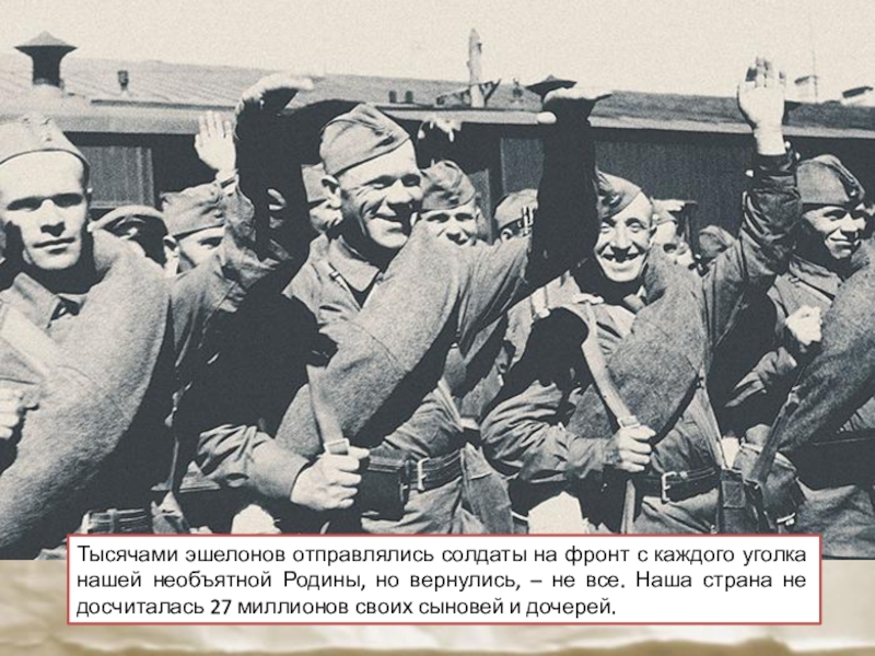 Слайд 8Тысячами эшелонов отправлялись солдаты на фронт с каждого уголка нашей необъятной