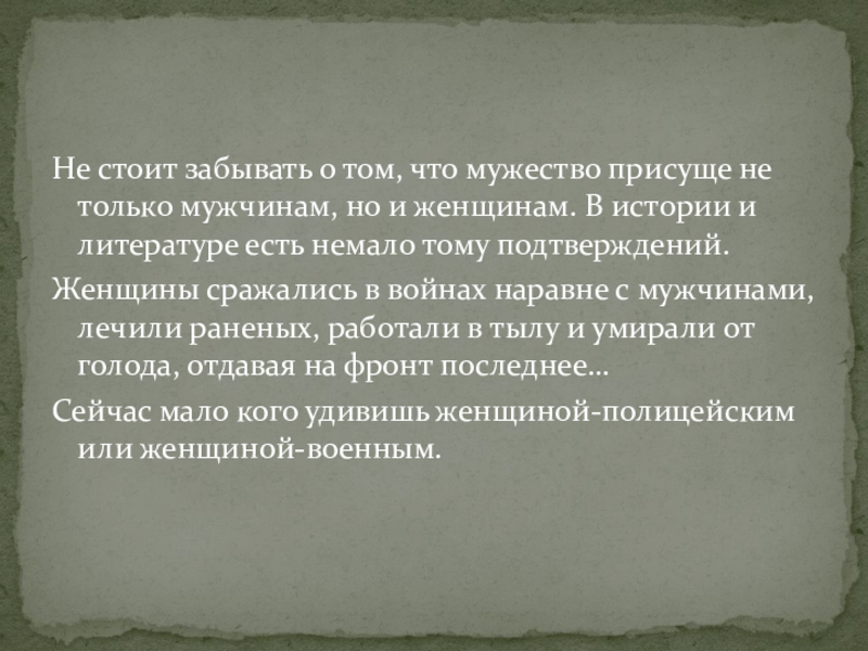 Слайд 20Не стоит забывать о том, что мужество присуще не только мужчинам,