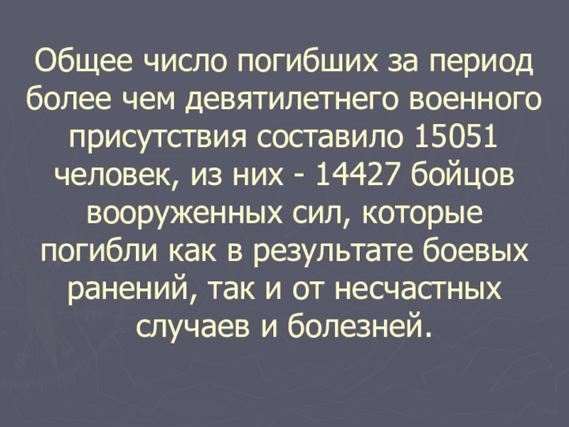 Слайд 12Общее число погибших за период более чем девятилетнего военного присутствия составило