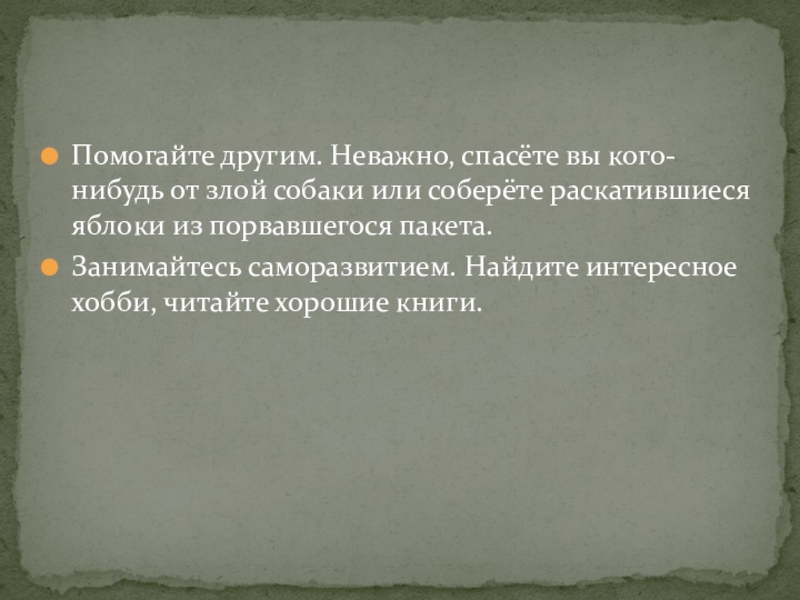 Слайд 31Помогайте другим. Неважно, спасёте вы кого-нибудь от злой собаки или соберёте