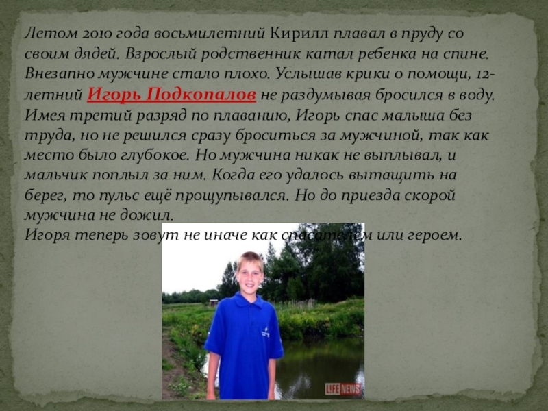 Слайд 26Летом 2010 года восьмилетний Кирилл плавал в пруду со своим дядей.