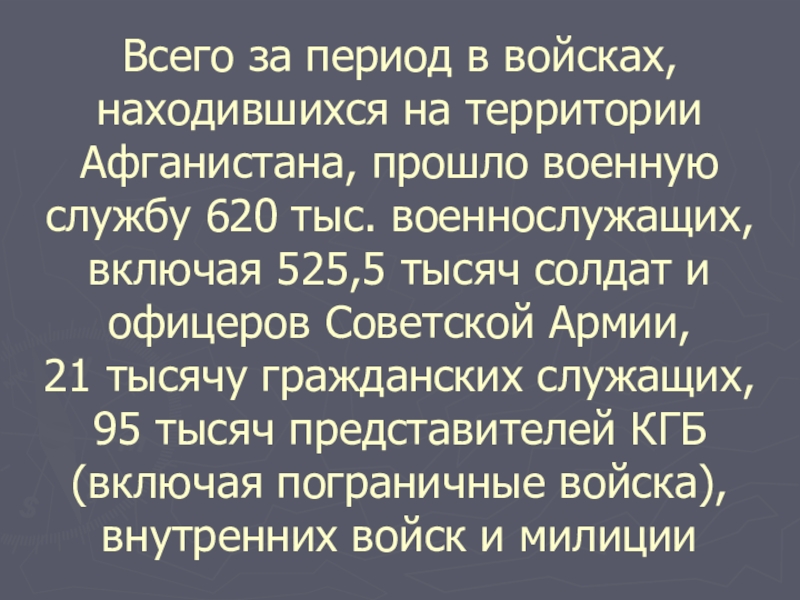 Слайд 11Всего за период в войсках, находившихся на территории Афганистана, прошло военную