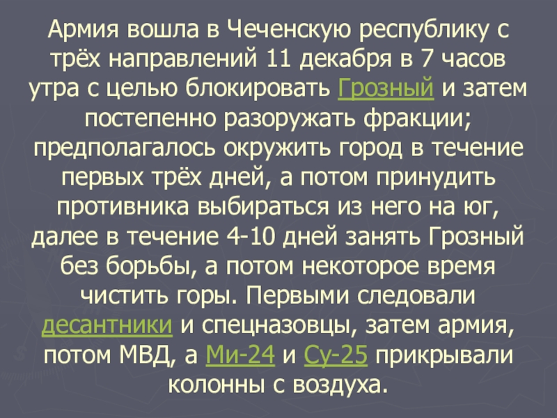 7 часов утра с целью блокировать Грозный и затем постепенно разоружать фракции; предполагалось окружить город в течение первых трёх дней, а потом принудить противника выбираться из него на юг, далее в течение 4-10 дней занять Грозный без борьбы, а потом некоторое время чистить горы. Первыми следовали десантники и спецназовцы, затем армия, потом МВД, а Ми-24 и Су-25 прикрывали колонны с воздуха.