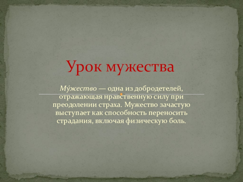 Слайд 1Му́жество — одна из добродетелей, отражающая нравственную силу при преодолении страха. Мужество