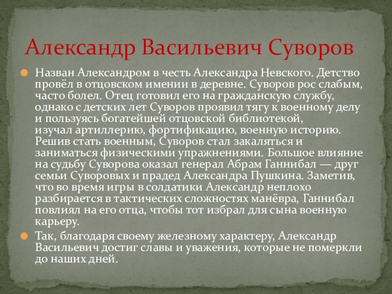 деревне. Суворов рос слабым, часто болел. Отец готовил его на гражданскую службу, однако с детских лет Суворов проявил тягу к военному делу и пользуясь богатейшей отцовской библиотекой, изучал артиллерию, фортификацию, военную историю. Решив стать военным, Суворов стал закаляться и заниматься физическими упражнениями. Большое влияние на судьбу Суворова оказал генерал Абрам Ганнибал — друг семьи Суворовых и прадед Александра Пушкина. Заметив, что во время игры в солдатики Александр неплохо разбирается в тактических сложностях манёвра, Ганнибал повлиял на его отца, чтобы тот избрал для сына военную карьеру.