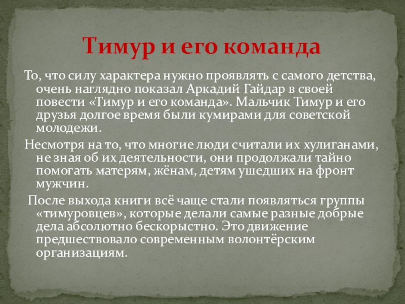 показал Аркадий Гайдар в своей повести «Тимур и его команда». Мальчик Тимур и его друзья долгое время были кумирами для советской молодежи.