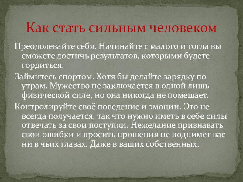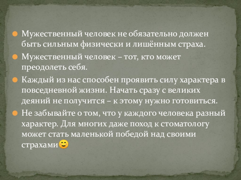 Слайд 2Мужественный человек не обязательно должен быть сильным физически и лишённым страха.