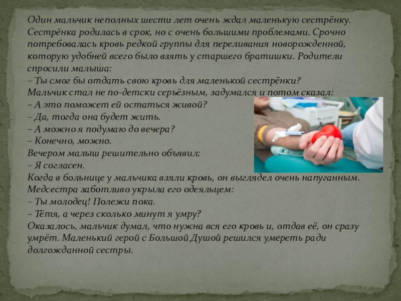 Оказалось, мальчик думал, что нужна вся его кровь и, отдав её, он сразу умрёт. Маленький герой с Большой Душой решился умереть ради долгожданной сестры.