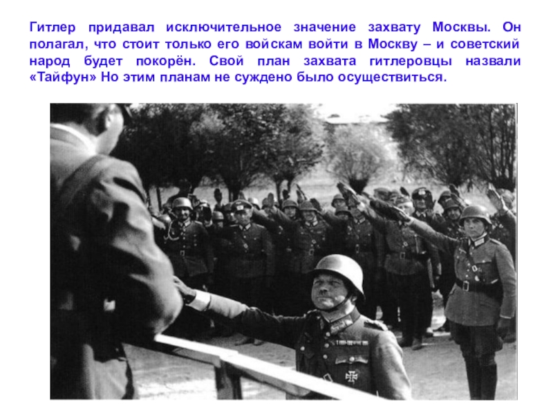 Слайд 8Гитлер придавал исключительное значение захвату Москвы. Он полагал, что стоит только