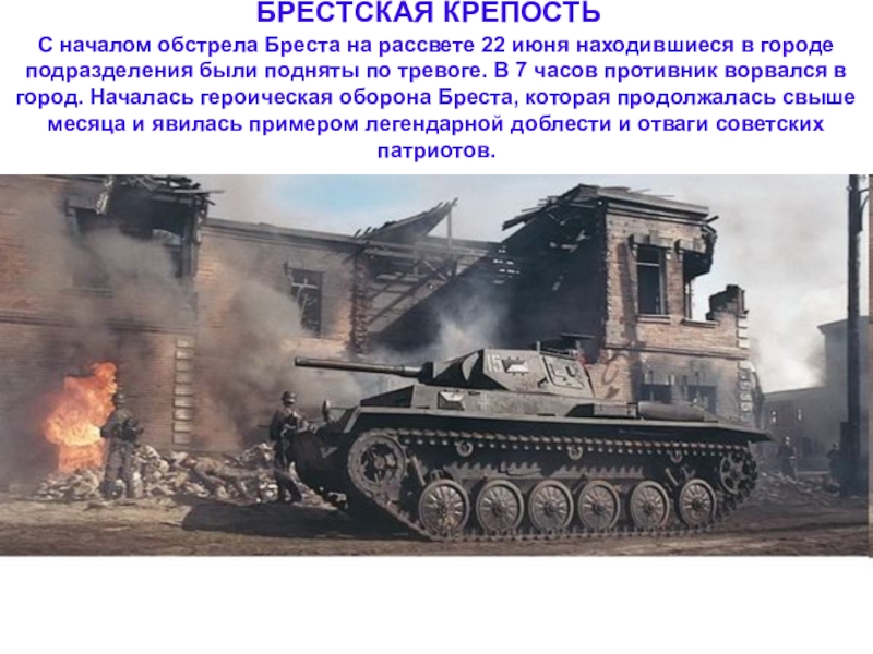 С началом обстрела Бреста на рассвете 22 июня находившиеся в городе подразделения были подняты по тревоге. В 7 часов противник ворвался в город. Началась героическая оборона Бреста, которая продолжалась свыше месяца и явилась примером легендарной доблести и отваги советских патриотов.