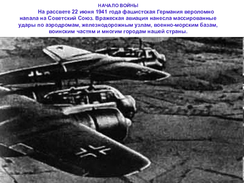 1941 года фашистская Германия вероломно напала на Советский Союз. Вражеская авиация нанесла массированные удары по аэродромам, железнодорожным узлам, военно-морским базам, воинским частям и многим городам нашей страны.
