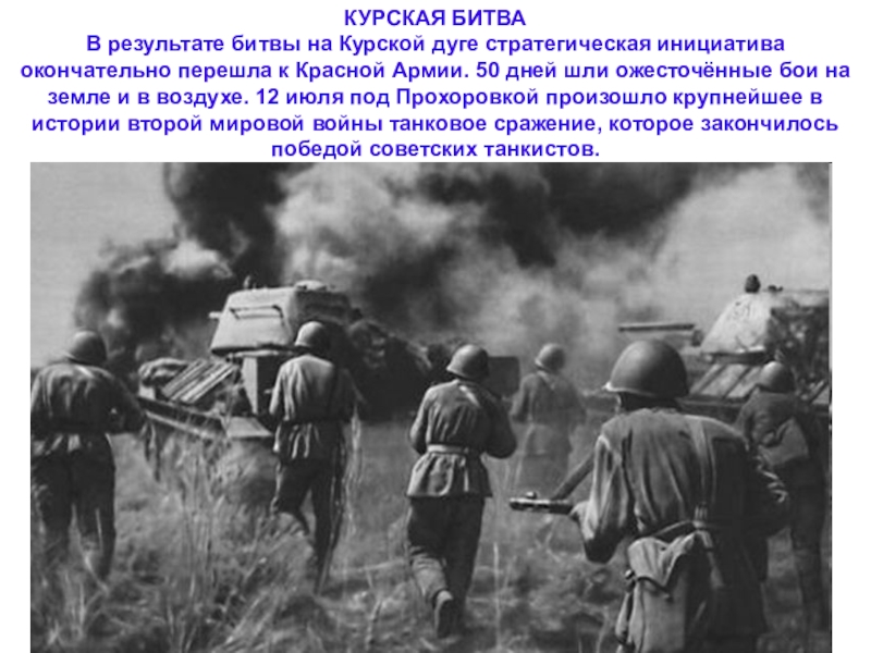 к Красной Армии. 50 дней шли ожесточённые бои на земле и в воздухе. 12 июля под Прохоровкой произошло крупнейшее в истории второй мировой войны танковое сражение, которое закончилось победой советских танкистов.