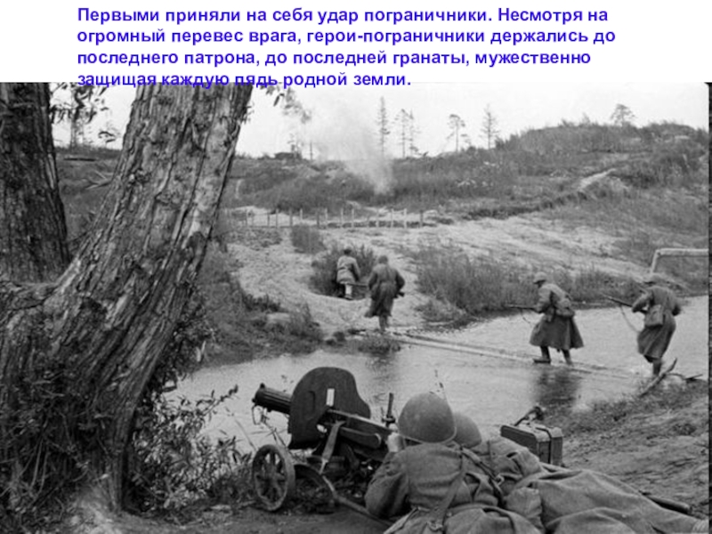 Слайд 5Первыми приняли на себя удар пограничники. Несмотря на огромный перевес врага,