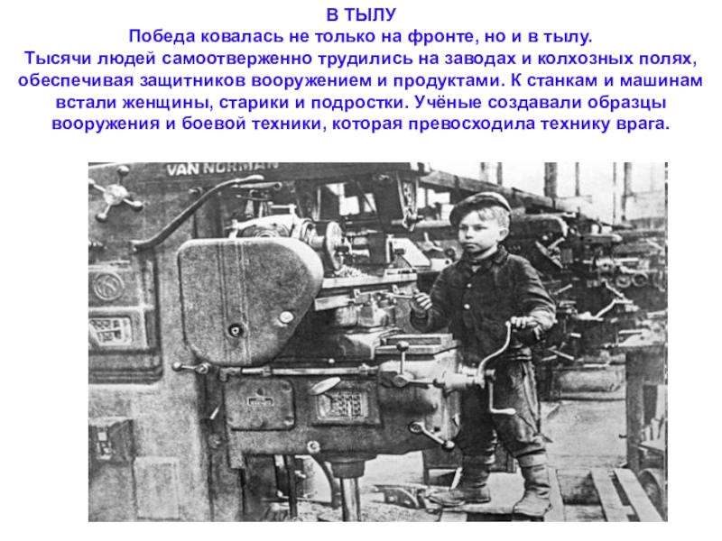 Тысячи людей самоотверженно трудились на заводах и колхозных полях, обеспечивая защитников вооружением и продуктами. К станкам и машинам встали женщины, старики и подростки. Учёные создавали образцы вооружения и боевой техники, которая превосходила технику врага.