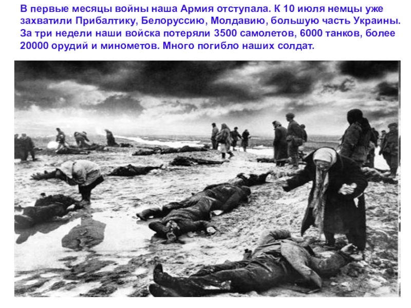 Слайд 7В первые месяцы войны наша Армия отступала. К 10 июля немцы