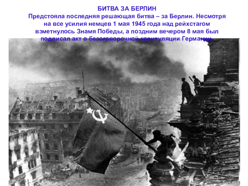 все усилия немцев 1 мая 1945 года над рейхстагом взметнулось Знамя Победы, а поздним вечером 8 мая был подписал акт о безоговорочной капитуляции Германии.