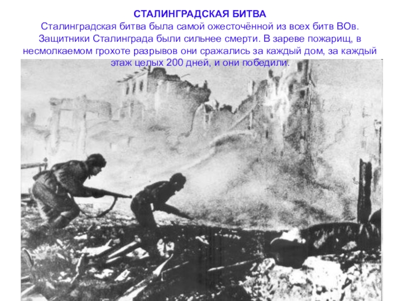 Сталинграда были сильнее смерти. В зареве пожарищ, в несмолкаемом грохоте разрывов они сражались за каждый дом, за каждый этаж целых 200 дней, и они победили.
