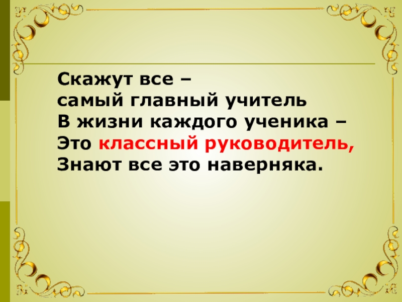 Скажут все – самый главный учитель В жизни каждого ученика – Это классный руководитель, Знают все это наверняка.
