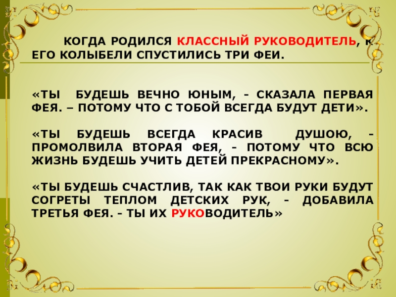 КОГДА РОДИЛСЯ КЛАССНЫЙ РУКОВОДИТЕЛЬ, К ЕГО КОЛЫБЕЛИ СПУСТИЛИСЬ ТРИ ФЕИ.«ТЫ БУДЕШЬ ВЕЧНО ЮНЫМ, -