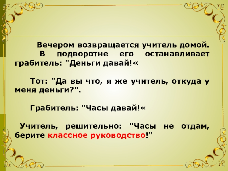 Вечером возвращается учитель домой.    В подворотне его останавливает грабитель:
