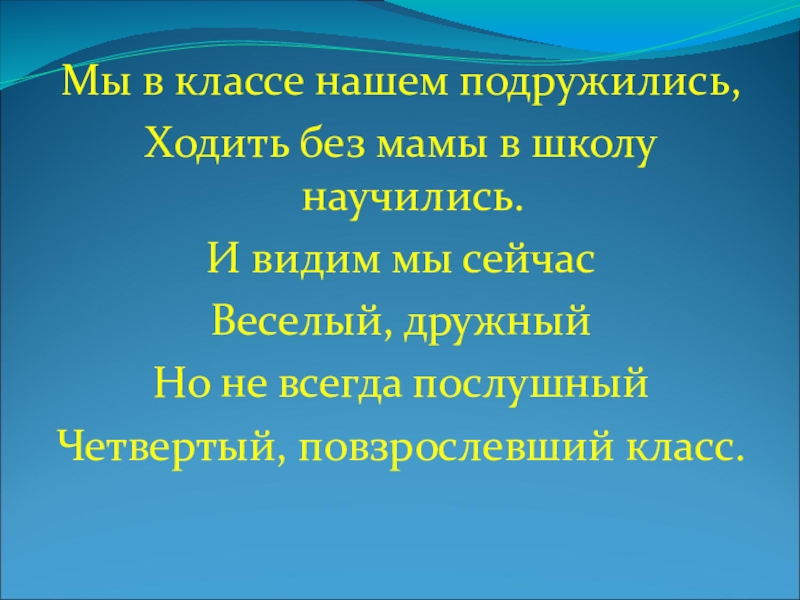 Мы в классе нашем подружились,Ходить без мамы в школу научились.И видим мы сейчас Веселый, дружныйНо не всегда