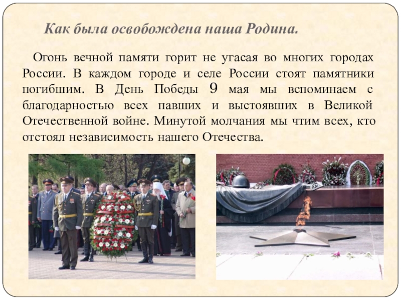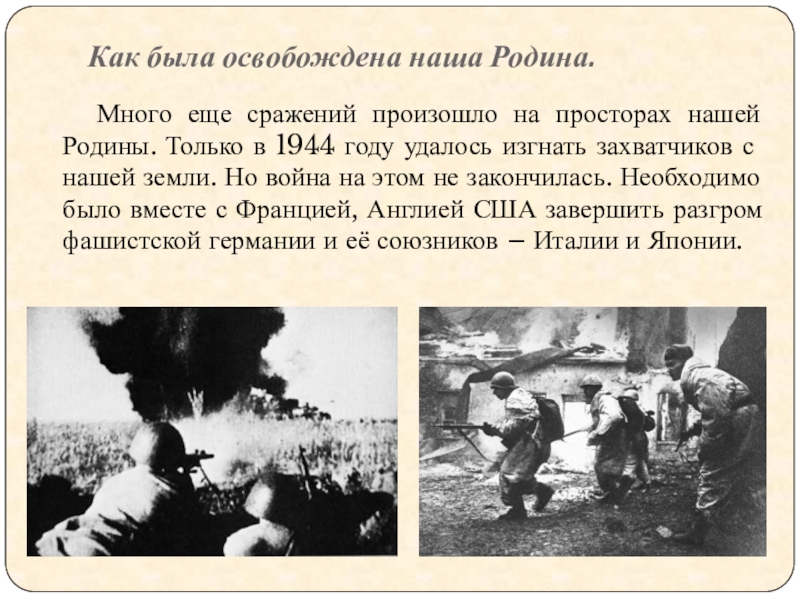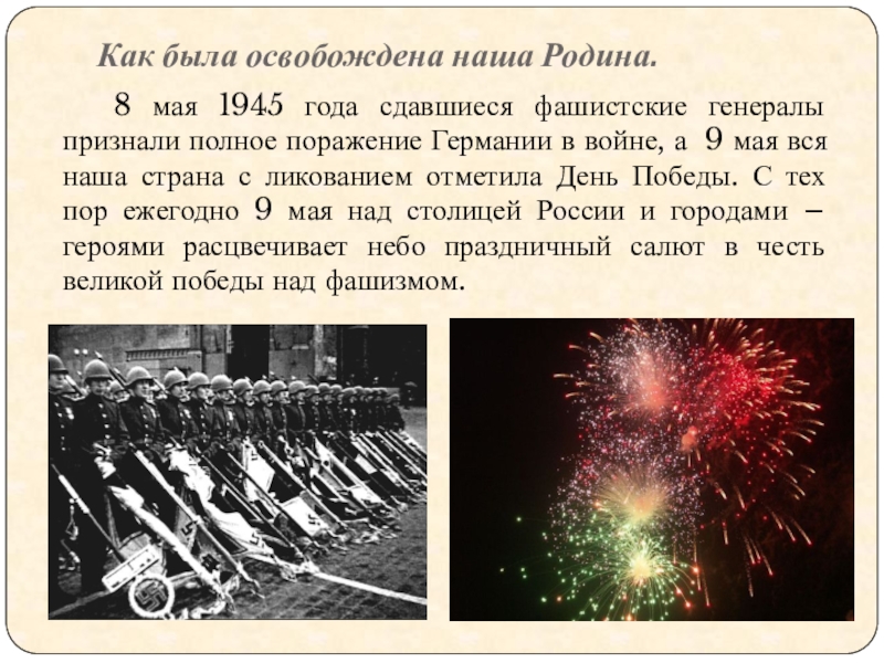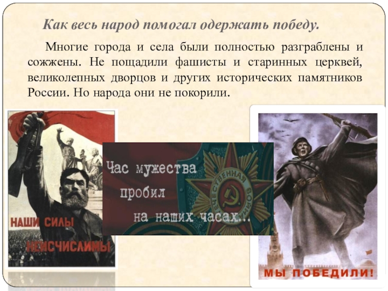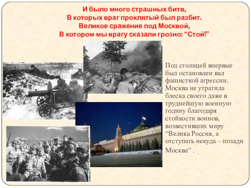 Под столицей впервые был остановлен вал фашисткой агрессии. Москва не утратила блеска своего даже в труднейшую военную годину благодаря стойкости воинов, возвестивших миру “Велика Россия, а отступать некуда – позади Москва” .