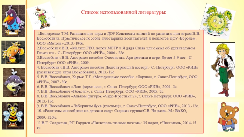 1.Бондаренко Т.М. Развивающие игры в ДОУ Конспекты занятий по развивающим играм В.В. Воскобовича. Практическое пособие для старших воспитателей и педагогов ДОУ.-Воронеж: ООО «Метода»,2013.-190с.