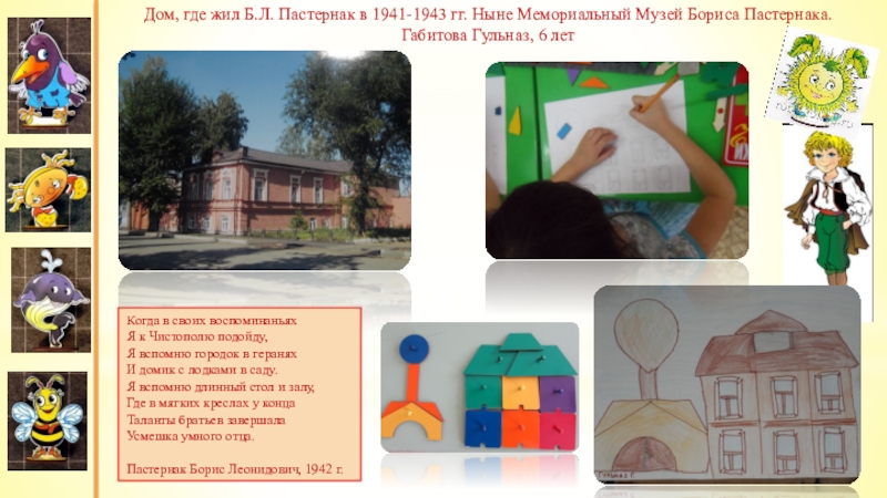 В ней представлены экспонаты о жизни и творчестве Б. Постернака в г.Чистополь, его литературном окружении, быте, творческих и дружеских контактах. Воссоздана комната, где жил поэт в эвакуации.