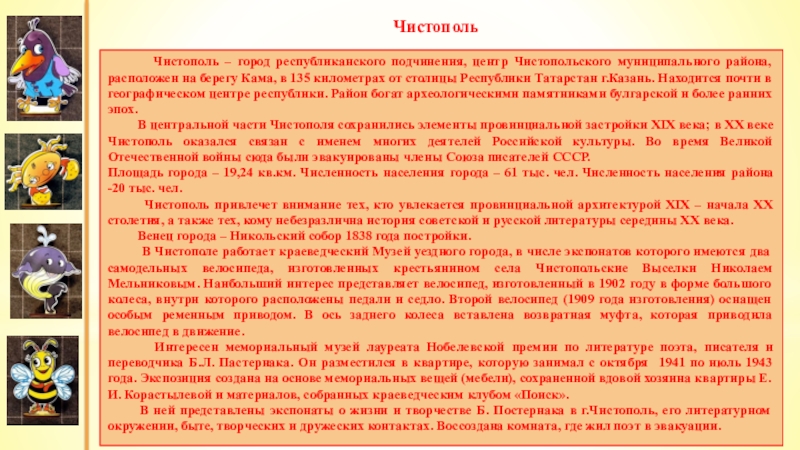 Чистополь – город республиканского подчинения, центр Чистопольского муниципального района, расположен на берегу Кама, в 135 километрах от столицы Республики Татарстан г.Казань. Находится почти в географическом центре республики. Район богат археологическими памятниками булгарской и более ранних эпох.