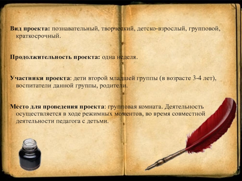 Вид проекта: познавательный, творческий, детско-взрослый, групповой, краткосрочный.
