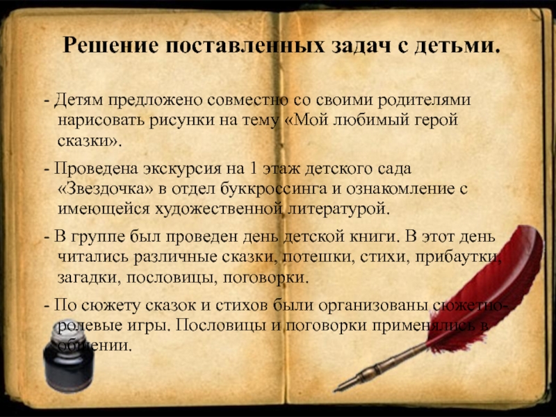 - По сюжету сказок и стихов были организованы сюжетно-ролевые игры. Пословицы и поговорки применялись в общении.