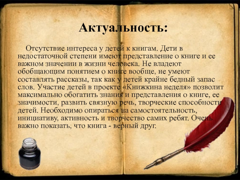 Отсутствие интереса у детей к книгам. Дети в недостаточной степени имеют представление о книге и ее важном значении в жизни человека. Не владеют обобщающим понятием о книге вообще, не умеют составлять рассказы, так как у детей крайне бедный запас слов. Участие детей в проекте «Книжкина неделя» позволит максимально обогатить знания и представления о книге, ее значимости, развить связную речь, творческие способности детей. Необходимо опираться на самостоятельность, инициативу, активность и творчество самих ребят. Очень важно показать, что книга - верный друг.