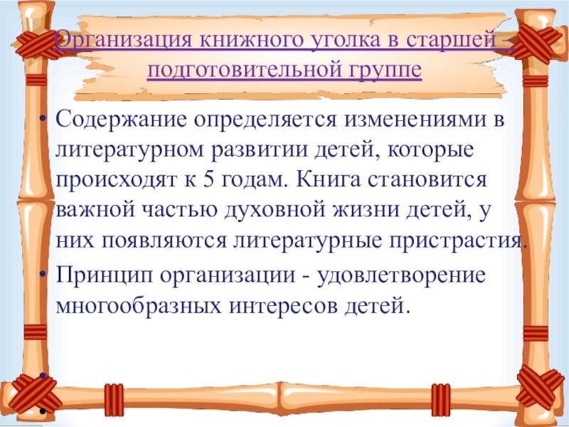 Слайд 4Организация книжного уголка в старшей – подготовительной группе