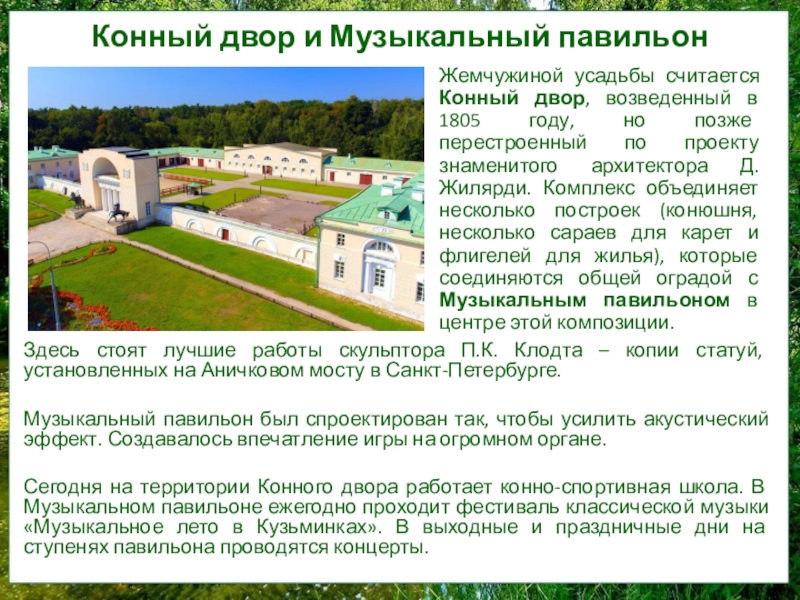 Усадьба Кузьминки считается одним из красивейших имений Москвы и Подмосковья. Она по праву занимает почетное место среди дворянских усадеб XVIII-XIX вв. 300-летняя история усадьбы связана с именами известнейших дворянских родов и выдающихся деятелей культуры – баронов Строгановых, князей Голицыных, архитекторов и скульпторов Р. Казакова, И. Еготова, И. Жеребцова, Д. Жилярди, М. Быковского, П. Клодта, И. Витали, А.Н.Воронихина и др.