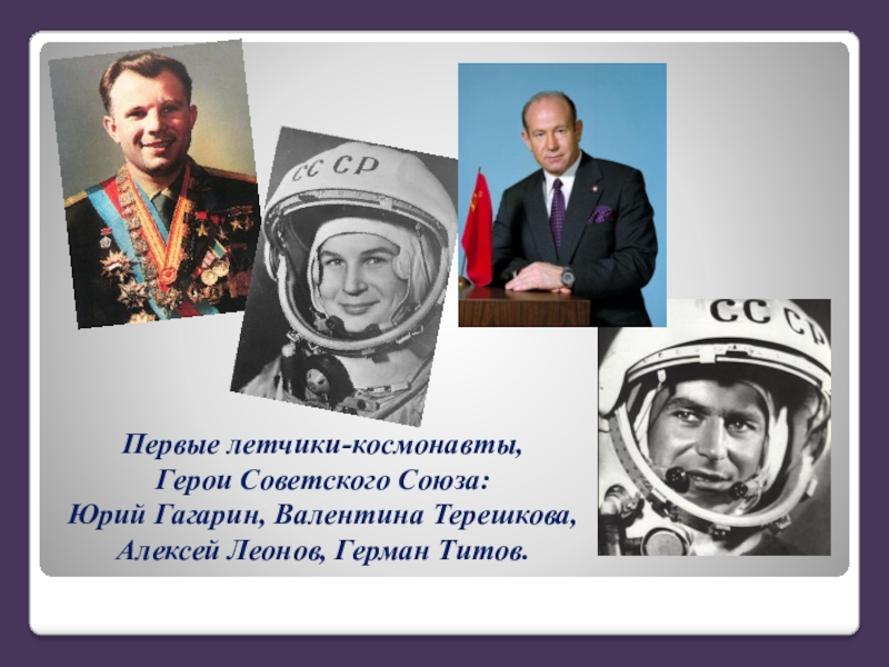 Слайд 5Первые летчики-космонавты, Герои Советского Союза: Юрий Гагарин, Валентина Терешкова, Алексей Леонов, Герман