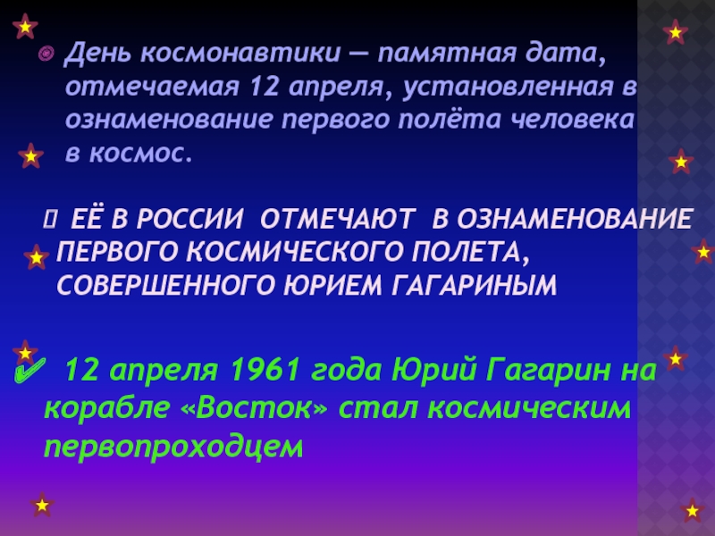 День космонавтики — памятная дата, отмечаемая 12 апреля, установленная в ознаменование первого полёта человека в космос.
