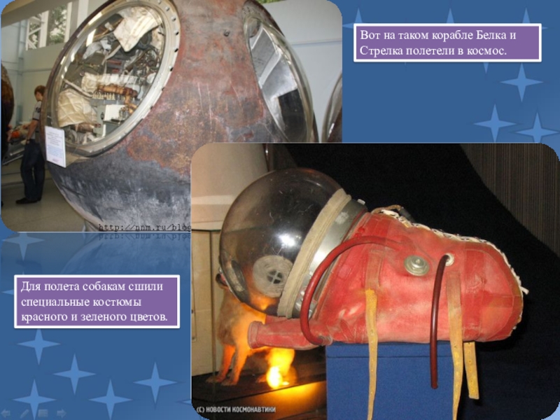 Вот на таком корабле Белка и Стрелка полетели в космос.Для полета собакам сшили специальные костюмы красного и