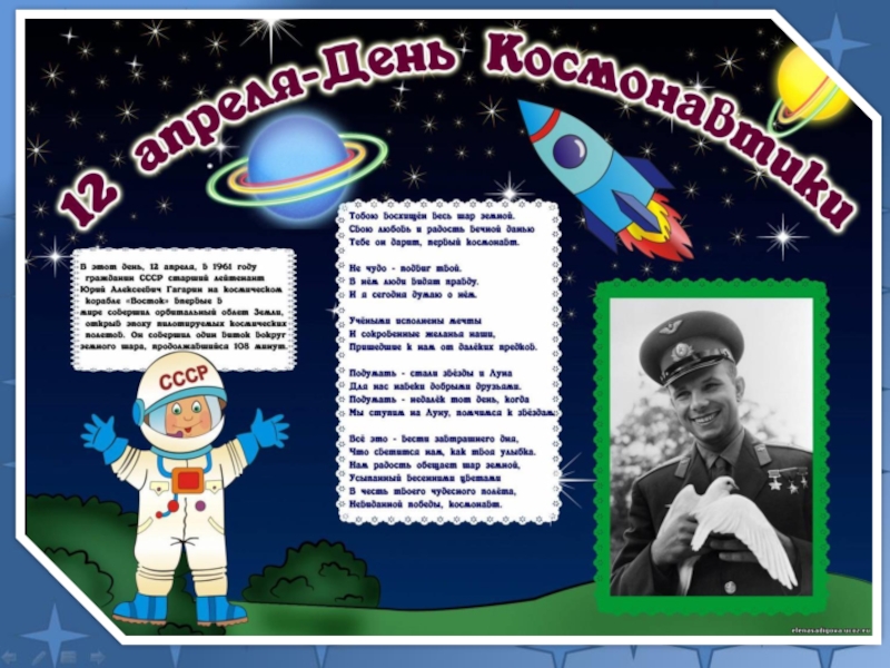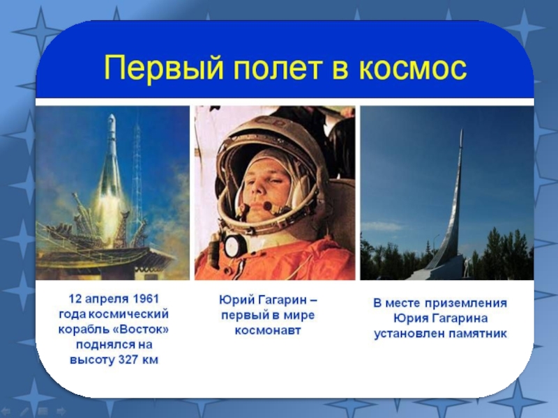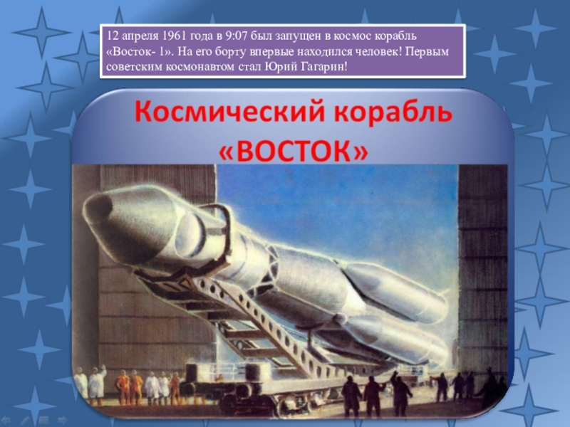 12 апреля 1961 года в 9:07 был запущен в космос корабль «Восток- 1». На его борту впервые