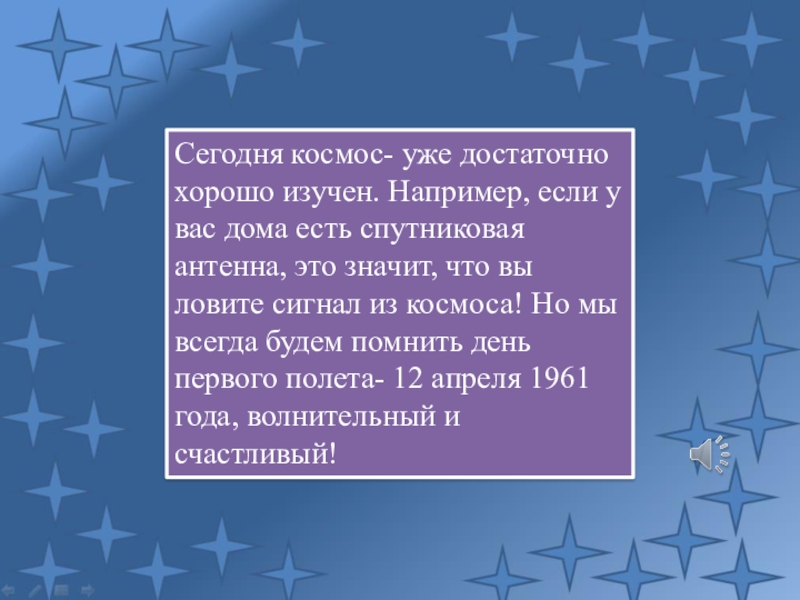 есть спутниковая антенна, это значит, что вы ловите сигнал из космоса! Но мы всегда будем помнить день первого полета- 12 апреля 1961 года, волнительный и счастливый!