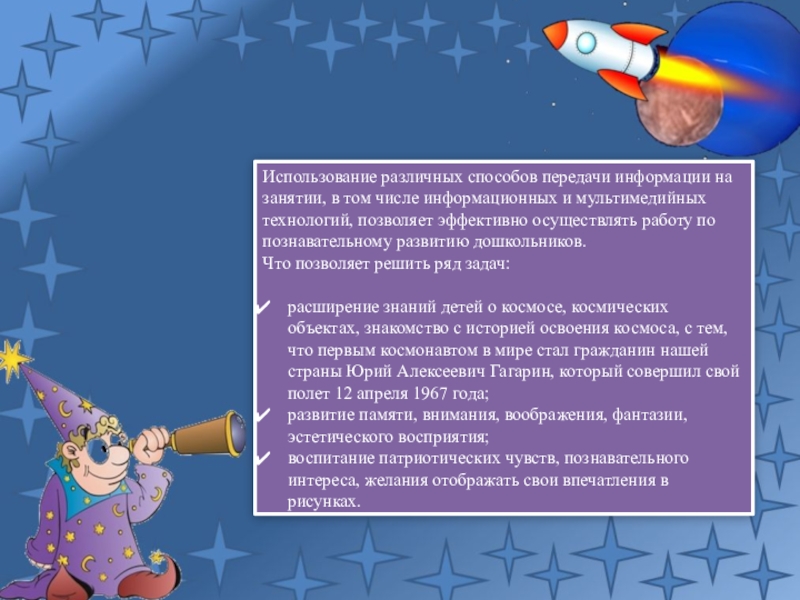 Использование различных способов передачи информации на занятии, в том числе информационных и мультимедийных технологий, позволяет эффективно осуществлять работу по познавательному развитию дошкольников.Что позволяет решить ряд задач:расширение знаний детей о космосе, космических объектах, знакомство с историей освоения